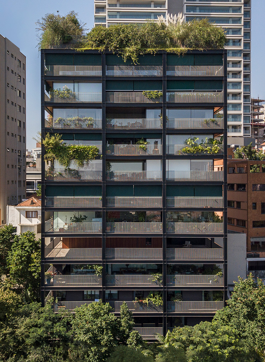 With modern and elegant architecture, the building lives up to its name and has eight apartments. Surrounded by a balcony, the building features landscaping by Rodrigo Oliveira, bringing sophistication and elegance.