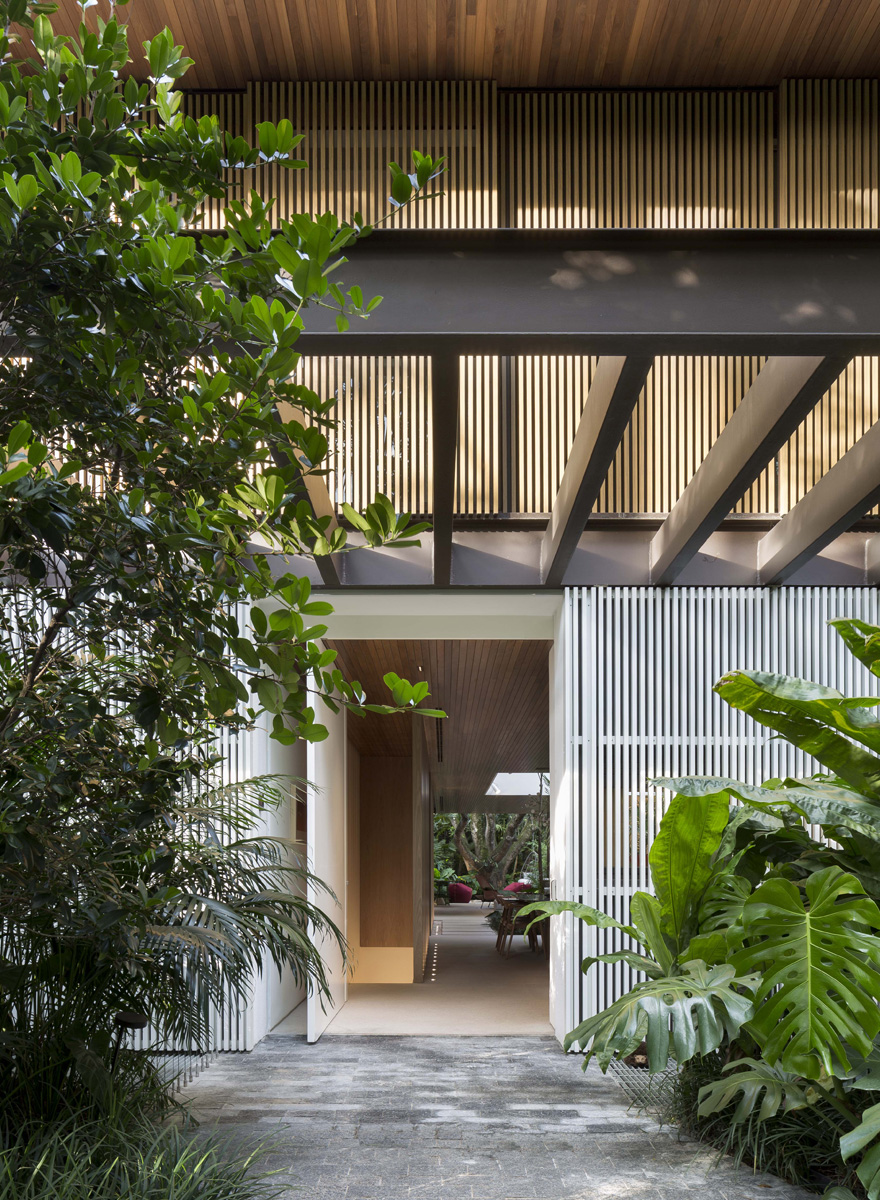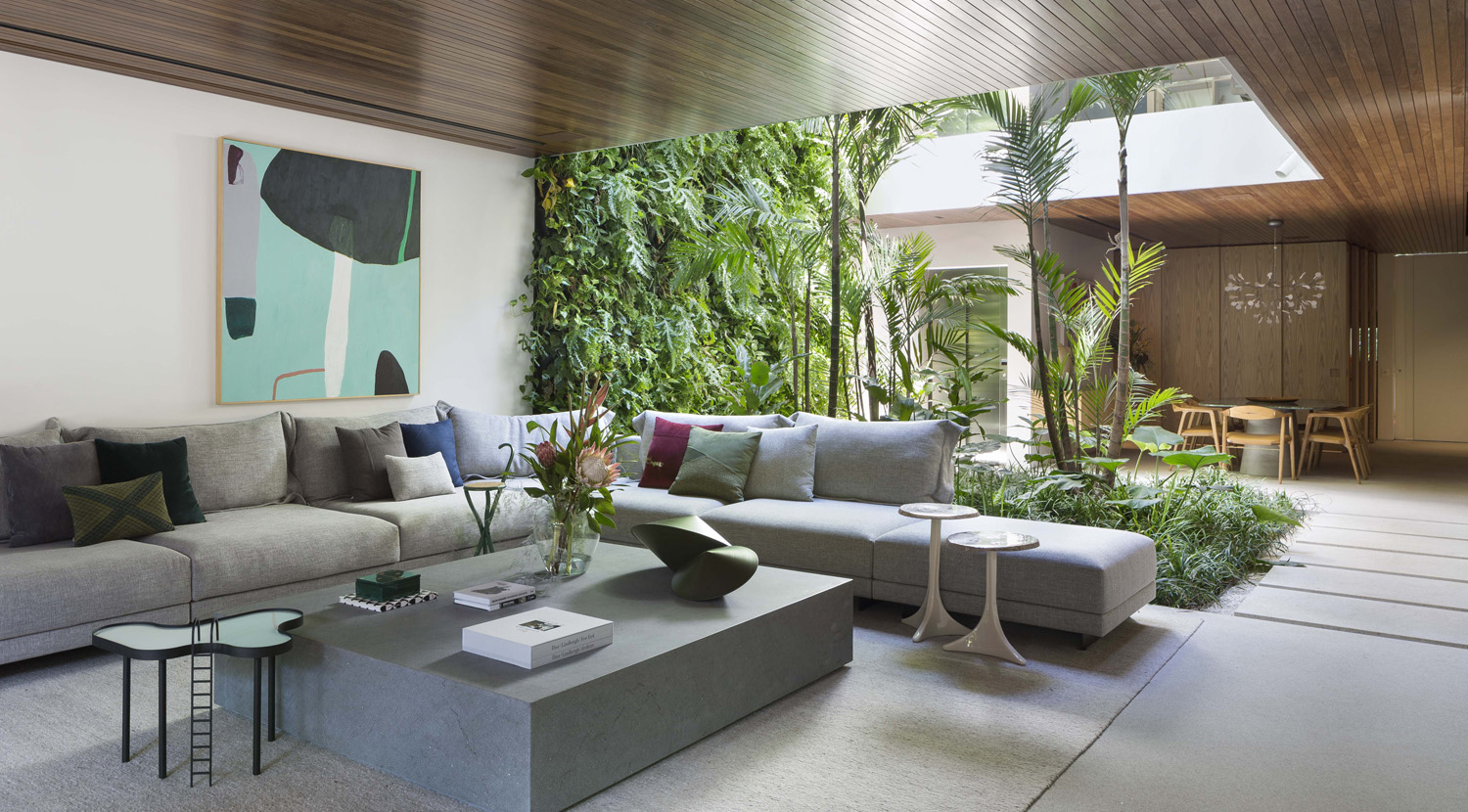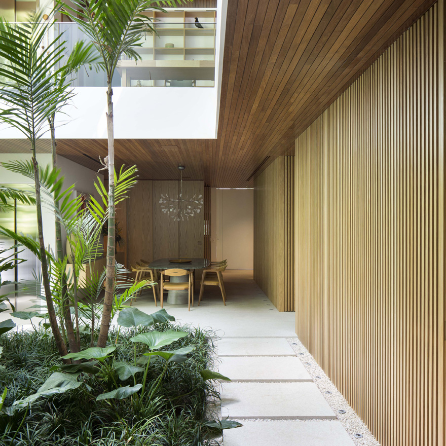 Em um condomínio arborizado em São Paulo, a residência RFD combina modernidade e contato com a natureza. O jardim interno conta com uma cobertura retrátil. Na área íntima, a presença de vegetação garante privacidade aos moradores.